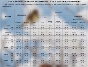 Փետրվարին օդի ամսական միջին ջերմաստիճանը կանխատեսվում է նորմայից բարձր 2-3 աստիճանով