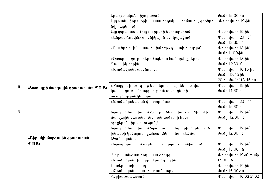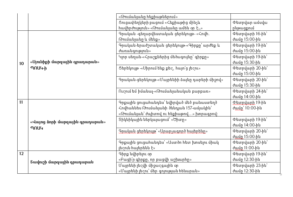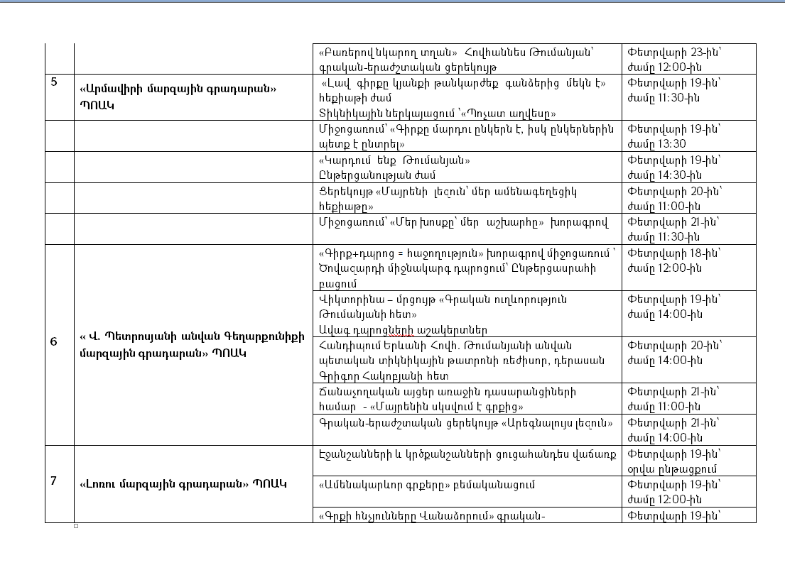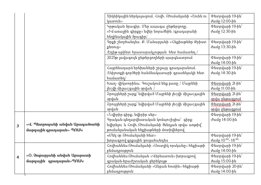 Գիրք նվիրելու և Մայրենի լեզվի միջազգային օրերի շրջանակում Կրթության, գիտության, մշակույթի և սպորտի նախարարության ենթակայությամբ գործող գրադարաններում տեղի կունենան թեմատիկ տարաբնույթ միջոցառումներ: